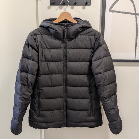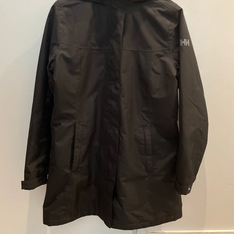 Naisten vähällä käytöllä ollut hupullinen musta HH:n takki. Takista löytyy vyötäröltä kiristysnyöri.