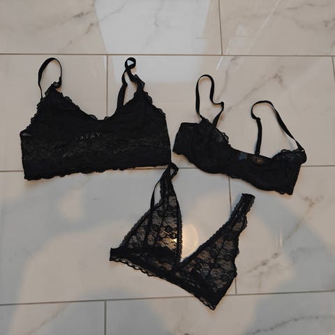 Beiget, mustat ja valkoiset. Edessä ihanaa pitsiä. Puetaan pujottamalla pään yli. Ei siis hakasia edessä eikä takana. Irrotettavat toppaukset. Sopii hoikalle ja pienempipoviselle. Koko L, mutta mielestäni koko M. 96 % nailon, 4 % spandex. Kone- ja käsinpesu viileällä vedellä. Kaikki kerralla j 15 e yhteensä kaikki kolme.