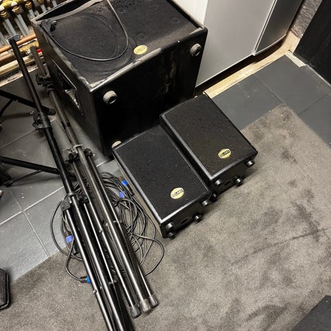 Kompakti passiivi PA laatikko. Soittelin hetken aikaa kitaraa tämän läpi, ihan soiva peli vaikkakin parhaimmillaan varmaan johonkin muuhun käyttötarkoitukseen. Pieniä kolhuja kärsinyt ja ruuvit kerännyt vähän ruostetta. Pohjassa myös kolo telineelle.