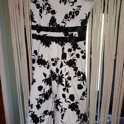 Käytetty mekko, koko arviona kun mitään lappua ei ole. Pari "timanttia" puuttuu, tästä kuva ja joku haalea tahra helmatyllissä. Selkäosa venyy eli koko joustaa. Säilytetty varastossa eli kaipaa tuuletusta/pesua