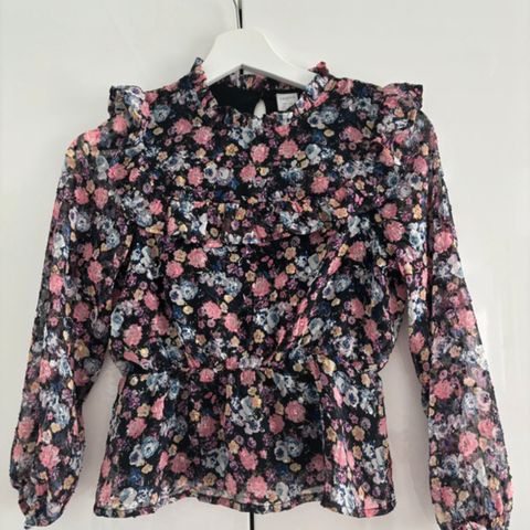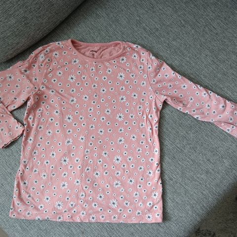Vaaleanpunainen pitkähihainen paita kukkien kuvilla. Koko 130 cm. Kuin uusi.