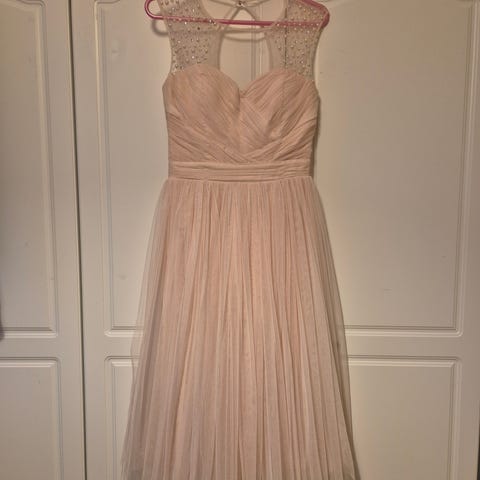 Kauniisti laskeutuva ja kevyt mekko. Lämmin vaaleanpunainen helmi/koru somistein.