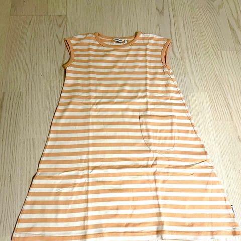 116cm Marimekko "uskallus 2" trikoomekko taskuilla, 100% puuvillaa. Vähän käytetty, tahraton ja ehjä. Pinnassa hiukan pesuhaitua. Pesty hajusteettomasti ja taloudessa ei eläimiä