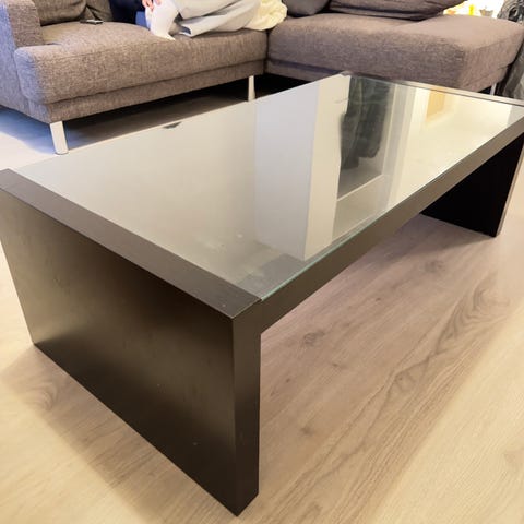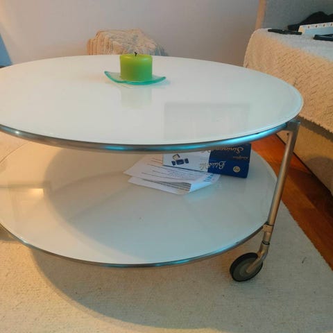 Valkoinen metallinen sohvapöytä lasikannella. Kohtalainen kunto, jos katsoo tarkkaan niin lasissa näkyy naarmuja.