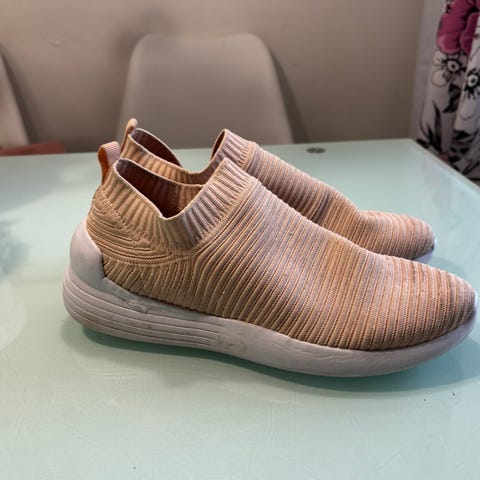 Mustat vähän käytetyt Xti lenkkarit. Matalahkot ehkä noin tulitikkulaatikon korkuiset korot. Nauhakiinnitys, ei vetoketjua. Kangas kimaltaa hieman. Kummankin kengän kärjessä aivan aavistus kukumaa ja toisen kengän ulkosyrjässä käsittääkseni suihkuttamastani kosteussuojasta aiheutunut vaaleanpi värjäymä. Katso kuvat. Sisäpohja ei ole irrotettavissa, mutta kahdella erilaisella irtopohjallisella arvioituna sisäpohjan pituus voisi olla 26 cm. Kengissä on minusta normaali tai hivenen kapeahkonlesti.