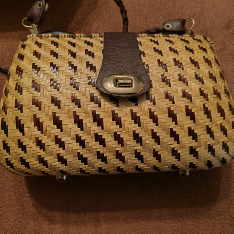 Mitat yläreuna 50, alareuna 30, korkeus 30. Vetoketju, sisäpuolella yksi 'lokero' jossa pieni tahra (suklaata?) .