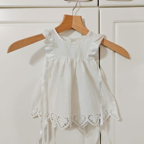 Myydään juhlamekko tytölle, koko 80. Paikoitellen mekon kirjailu hohtaa helmiäisenä.