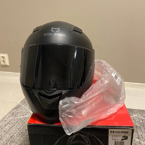 Course Raider 2.0 kypärä hyvässä kunnossa, aina pidetty kypärähuppua päässä. Kirkas lasi mukaan joka uusi kun vaihdoin tuon tummemman uutena heti.