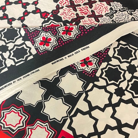 Myydään Marimekon "Ananas" -kangas, suunnittelija Maija Isola 1962, väri turkoosi, kuvion keskiosa pituussuunnassa, koko leveys 60cm, korkeus 185cm. Kapeammat turkoosit suikaleet kuvion reunasta, koko leveys 31cm ja pituus 190cm. Kaikkien kankaiden reunat päärmätty. Voi käyttää kaitaliinana tai vaikka kappaverhona.