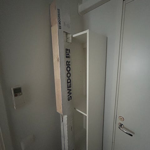 Uusi avaamaton paketti. Swedoorin valkoiseksi maalattu huulletun oven peruskarmi. Sisältää saranan. Karmissa ei ole tiivistettä.