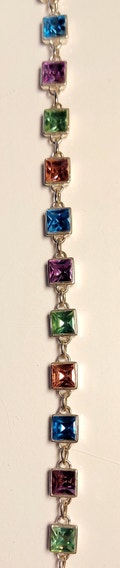Pastellivärisillä kivillä koristeltu hopeanvärinen kaulakoru.