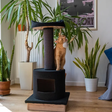 Tyylikkäät värit ja tyylikäs muotoilu - mustan ja harmaan sävyjen ansiosta tämä raapimatolppa sopii mihin tahansa sisustukseen.