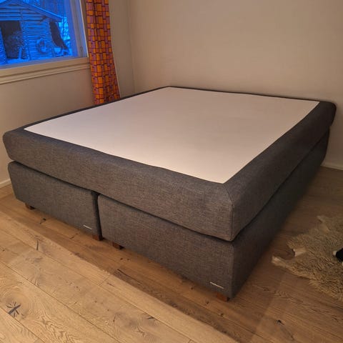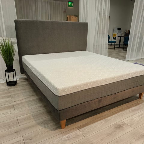 Myytävän sängyn jousitus on toisella puolella soft ja toisella firm (pehmeä ja tukeva). Paketti sisältää sijauspatjan ja 18cm korkeat jalat.