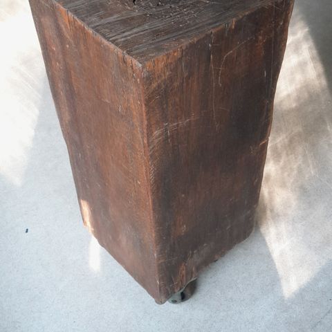 Tähän on laitettu kylkiin järeät messinkikahvat, samasta laivasta kuin itse puukin. Etuosaan laitettu knaapi on puolestaan paljon pienemmästä purjealuksesta mutta vanha sekin. Puu on hiottu ja aikoinaan öljytty. Sileä ja mahtavan patinoitunut. ollut minulla näin pystyssä. Sellaisena laskutasona tai lampun alustana. Tämän voisi asettaa siis myös lappeelleen. Penkiksi tai pöydäksi. Tv-tasoksikin. Mitat ovat noin 42 kertaa 22 kertaa 120. Jos laittaisin tämän lappeelleen, rakentelisin alle jalat tai järeät rullat niin olisi käytännöllisempi korkeudeltaan. On muuten painava kampe. Kahvat sivuilla on laitettu sellaiselle korkeudelle, että tätä pystyy nostamaan, juuri ja juuri liikuttelemaan yksikin ihminen. Aivan ehdottoman uniikki esine toiselta puolen maailmaa. Keneltäpä löytyy tarpeeksi rustiikkinen sisustus jonne tällainen soveltuu? Tätä ei lähetetä. Tämä täytyy noutaa tai voin järjestää kuljetuksen lähialueelle. Helsinki ja sen ympäristö EI ole lähialuetta! retro vintage antiikki meriantiikki old wood block pölkky köli salvage rustic antique sailboat brass pylväs pöytä taso sivupöytä ship relic unique