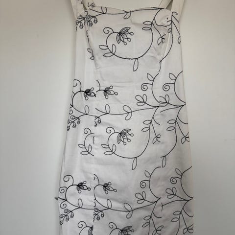 Upea Marimekon made in Finland Jukka Rintalan suunnittelema vintage juhlamekko valkoinen Velazquez koko 38. Mekko on kirjailtu (ei painettu) mustalla langalla kukkakakuvioin, kangas on 97 % puuvillaa, 3 % elastaania. Kangas on vähän joustava. Mekossa on vuori, ja olkaimet, jotka kiinnitetään taakse napeilla, joten niiden pituutta voi säädellä. Mekon etu puolella on kaksi muotoilevaa saumaa ja takana kaksi muotolaskosta. Vetoketju on takana, siellä on myös pieni halkio. Mekon rinnanympärys n. 86 cm ja lantion ympärysmitta n. 95 cm.