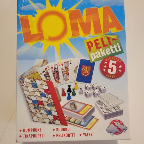Myydään peli-paketti, mikä sisältää pelit: humpuuki, sudoku, tikapuupeli, tavalliset pelikortit sekä yatzyn.