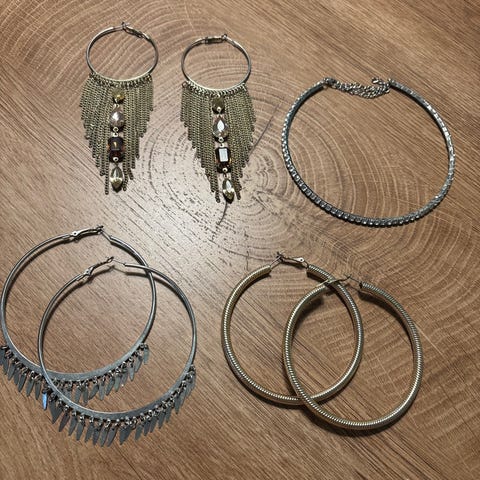 Myydään setti, joka sisältää hopeanvärisen korutelineen, kaula- ja rannekoruja sekä kaksi uutta kultaisen väristä avaimenperää.