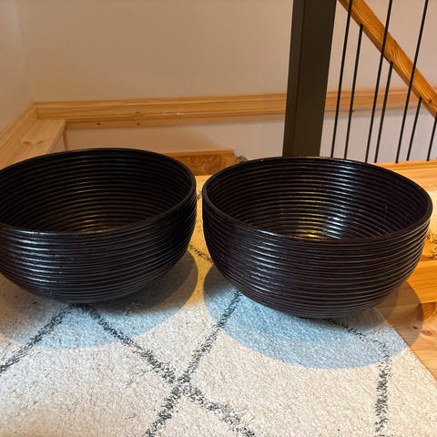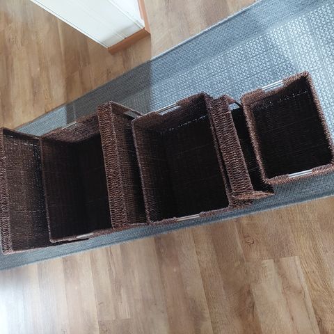 Ethän tingi kiitos. Kuusi koria, joista neljä viininpunaisia irroitettavalla ja pestävällä kankaalla ja kaksi puun väristä punosta. Punottu rottinki tai vastaava. Hyväkuntoiset. Tilavat, molemmat pinoutuvat sisäkkäin.