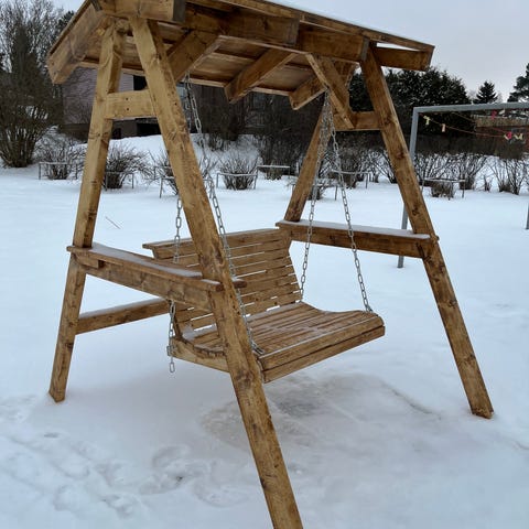 Kotimainen valmiiksi kasattu yhdenistuttava pihakeinu. Materiaalina kyllästetty mänty. Väri ruskea. Painoraja 200kg. Istuimen leveys 70cm. Keinun mitat: K190cm L133cm S141cm. Ketjuissa säätövaraa istuma-asennon muuttamiseksi. Lisähinnasta toimitus lähialueelle.