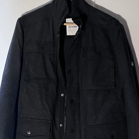 Upea, moitteettomassa kunnossa oleva Ben Sherman -villakangastakki. Musta, puolipitkä.