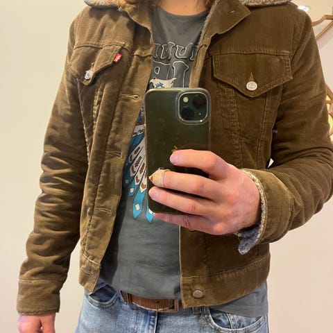 Lievä "farkkutakkijuova" tuossa nappilistan ja rintataskujen välillä joka aina vääjäämättä muodostuu Leviksiin, eli näkee kuinka voima siitä välittyyy kankaan kantama olkalinjaan, välillä on niin äärimmäinen että alkaa näyttää huonolta mutta ei tässä.