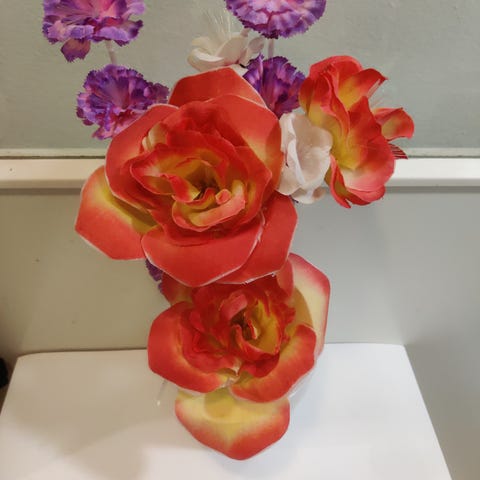 Kuivakukille tarkoitettu astia. Korkeus 23 cm. Kuvan kukat eivät ole alkuperäisestä asetelmasta. Nouto Katajanokalta.
