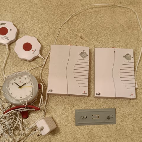 Ovelle asennettava lähetin on ulkonäöltään ja kunnoltaan kuin uusi. Taskuvastaanotin on hieman elämää nähnyt eli ulkonäöltään kohtalainen, mutta toimintakunnoltaan kuin uusi. Painonappilähetin 15€, taskuvastaanotin 45€, yhteensä 60€.