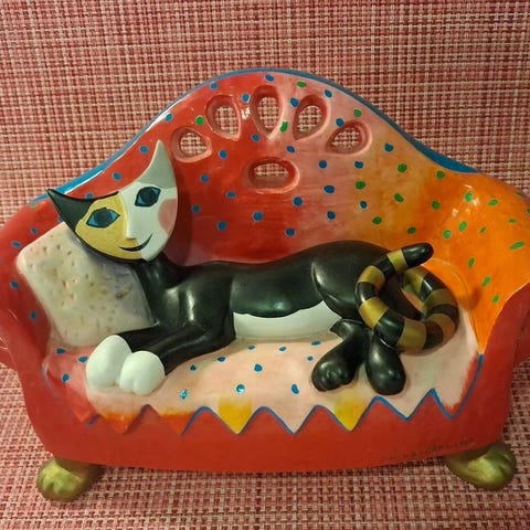 Kaunis soittorasia jossa Cacao-kissa lepäilee sohvalla ja kuuntelee soittorasian melodiaa "Pussy Cat" . Soittorasia on toimiva ja melodia soi hyvin, ollut erittäin vähäisellä käytöllä.