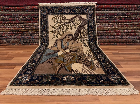 Käsinsolmittu iranilainen/keshan-matto. Tiheästi solmittu matto. Niitä on noin 500 000 solmua neliömetrillä. Vanha matto on vähintään 40/50 vuotta vanha. Hyvä matto hyvässä kunnossa.