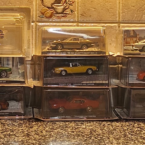 Hyväkuntoinen, täydellinen james bond autokokoelma. 61 autoa, tankki ja kopteri. Autoihin liittyvät lehdet myös tallessa. Kaikki autot omissa muovikoteloissaan, ei leikitty eikä availtu autojen laatikoita. Laatikot pölyisiä, muuten kunto priima. Tästä hieno setti bond tuotteiden keräilijälle.