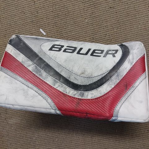 Maalivahdin kilpi Bauer Supreme. Ollut käytössä juniorilla. Hanskaosassa on kämmenpuolella muutama reikä ja kulumaa. Muuten kunto ok.