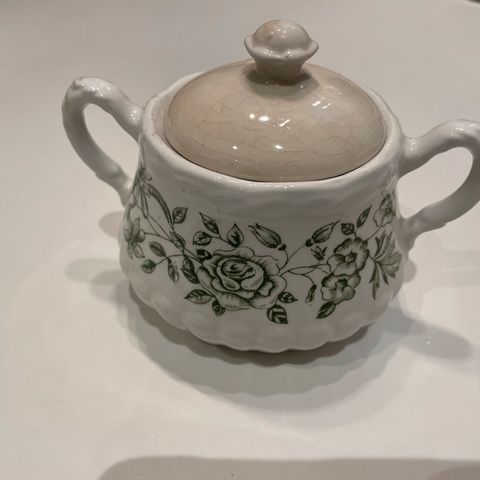 Hopeoitu, ei kiillotettu, mutta ehyt sokerikko/kermakko. Kannun korkeus 12 cm, sokerikon 15 kannen nuppiin asti.