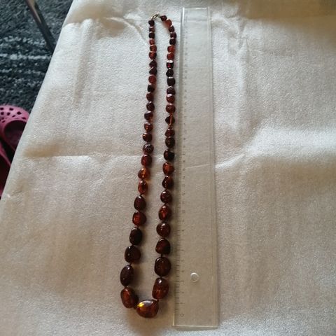 Lyhimpien helmien aitoudesta ei täyttä varmuutta, muut ovat aitoa meripihkaa. Helmien hinta on 40 €/kpl