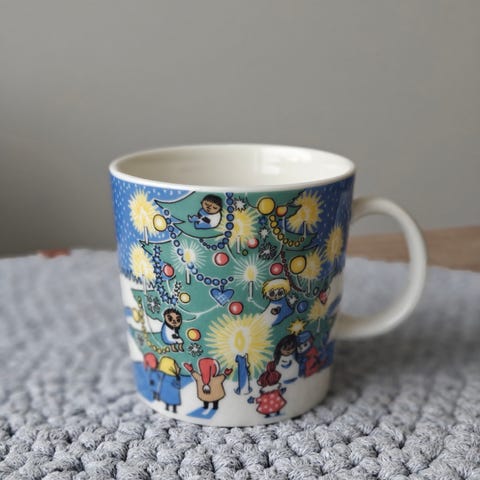 Muumimuki ja -kulho Kuusen alla, vuodelta 2013, käyttämättömät, virheettömät ja tarrat molemmissa. Erikseen ostettuna muki 45 e ja kulho 25 e, yhteishinta 60 e. Mielellään nouto.