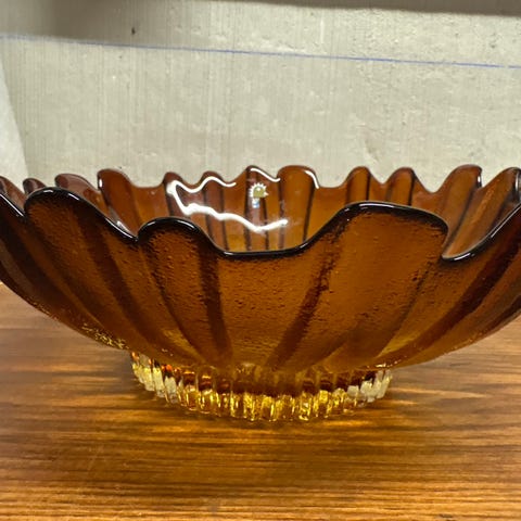 Vanha vihreä - läpinäkyvä lasikulho. Ilmeisesti Tapio Wirkkalan Revontulet -sarjaa. Mielestäni hyvässä kunnossa, enkä ainakaan yhtäkkiä löytänyt käytöstä johtuneita virheitä.