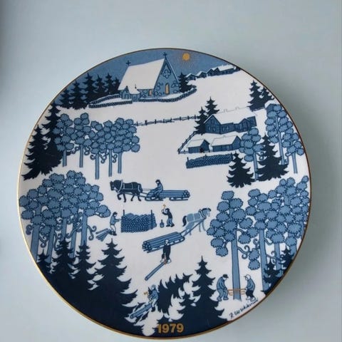 Raija Uosikkinen suunnitellut Arabialle joululautasen. Vuosiluku 1979. Lautasen halkaisija 23 cm. Etupuolella signeeraus.