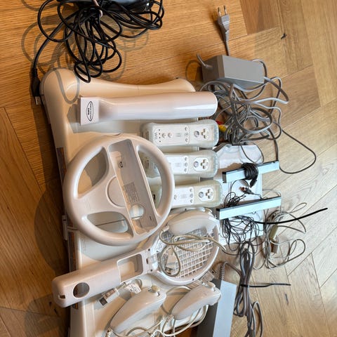 Konsoli, kaksi ohjainta, kaksi rattia ja kaksi peliä. Kaikki testattu toimivan.