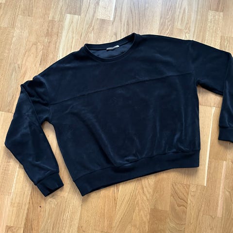 Reserved-merkin musta pitkähihainen paita, koko M. Etupuolella kaksi isoa kiiltävää vetoketjutaskua.