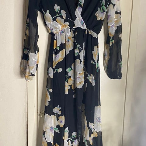 Kahdesti käytetty juhlavaatteena, hyväkuntoinen. Koko S. Pituus olkaimesta alahelmaan n. 100 cm, ympärys nauhan kohdalta 84 cm. Nouto.