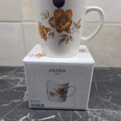 Arabian valmistama ja Olga Osolin suunnittelema Myrna sarjan kermakko. Täysin ehjä ja kolhuton. Ei kulumia. Korkeus 9.5cm ja leveys max.13cm.