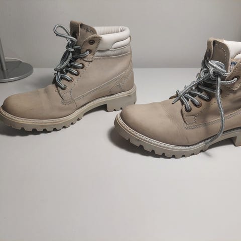 Myydään naisten mustat erittäin vähän käytetyt nahkaiset vuorettomat syyskengät / talvikengät /nilkkurit. Merkki Wrangler. Koko 38 (UK 5). Kapea malli. Paksua tukevaa nahkaa. Vahva kuviointi pohjassa.