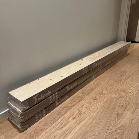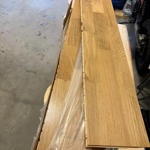 3 avaamatonta pakettia vaaleaa tammiparkettia (Lapua Floor). Harjattu pinta. 1 sauvainen. Stone washed.
