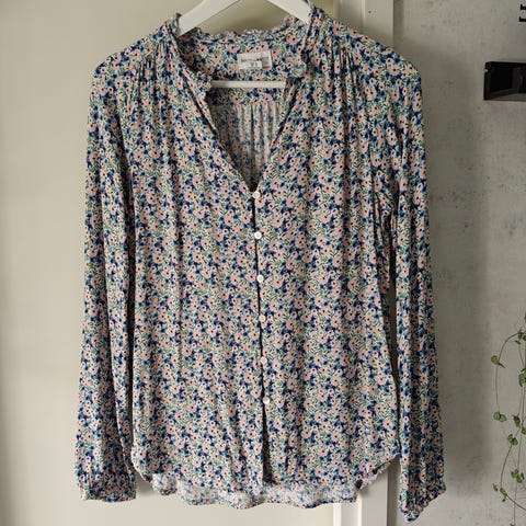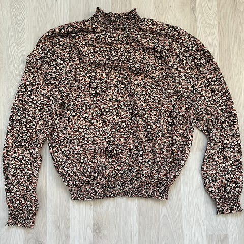 Paidan etupuoli kivasti laskeutuvaa hieman läpikuultavaa kukkakuvioista kangasta, takaa joustavaa mustaa kangasta. Persoonallinen leikkaus olkapäissä ja narukiinnitys hihoissa.
