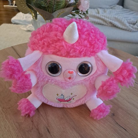 27cm pitkä ja 26cm leveä. Zuru Rainbocorns pehmo kovilla silmillä ja sydämen muotoinen kääntömaha.