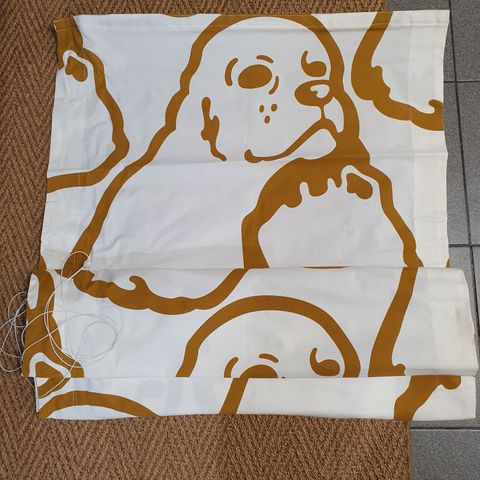 Sinivalkoinen Marimekon jurmo kankaasta ompelijalla teetetty laskosverho.