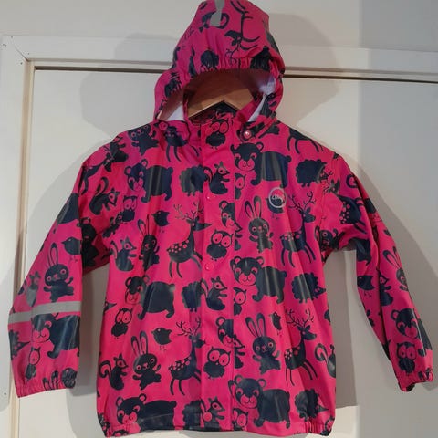 Myydään Everestin fleecevuorellinen sadetakki koko 122/128cm. Käytetty syksystä kevääseen. Takana nuppineulanpään kokoinen reikä.