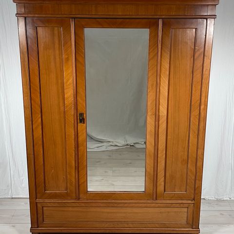 Tuotetiedot: Täyspuinen antiikkivaatekaappi, jonka sivuissa on yhteensä viisi hyllyä, joiden paikat ovat vaihdettavissa ja keskellä yksi vaatetanko, yksi kiinteä hylly vaatetangon yläpuolella ja yksi vetolaatikko. Keskimmäisen oven lukko toimii ja mukana tulee yksi avain. Kaapin keskimmäisestä ovesta puuttuu peili, mutta tilasimme uuden peilin ja asennamme sen ennen toimitusta. Toimitamme vaatekaapin ovet irrotettuina ja kasaamme sen paikan päällä toimituksen yhteydessä.