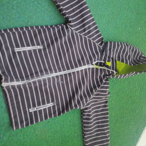 Paljon käytetty ja arkikäytössä ollut softselltakki. Vetoketjut toimii moitteettomasti ja heijastimet ehjät. Aran värin vuoksi reilusti tummentumia, joille en ole kokeillut tahranpoistoa. Edelleen huolettomiin leikkeihin toimiva takki.