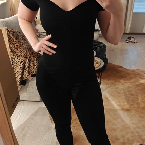 Mangon kukallinen shortsipuku / jumpsuit, joka näyytää päällä mekolta. Musta, kukallinen. Hihoissa aukot. Kokomerkintä S.