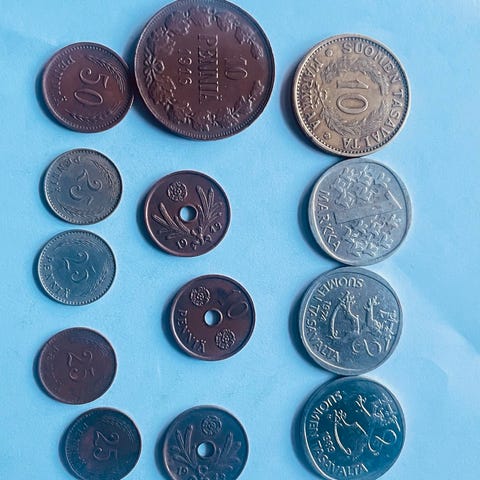 Kuvassa näkyvät pullot sisältäen markka ajan 1 pennisiä. Voit tarjota hintaa. Myydään kaikki kerralla.